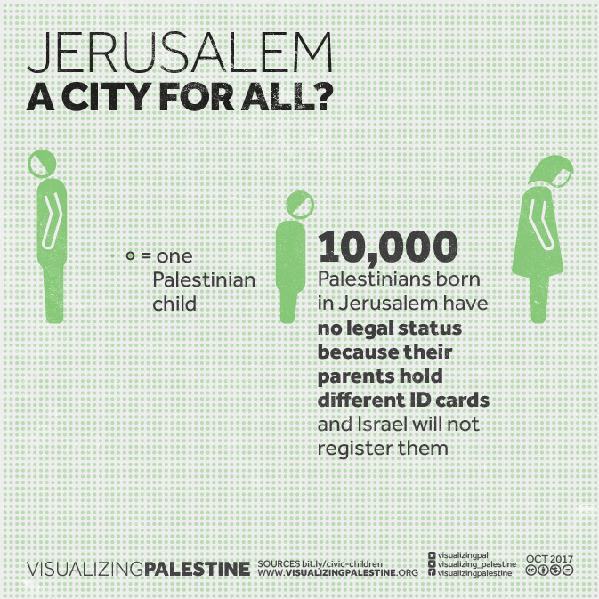 3- 10,000 Palestinian children in Jerusalem have no legal status because their parents hold different types of ID cards. Unregistered children have no access to education, health, and social services, putting them at a severe disadvantage respective to their peers.