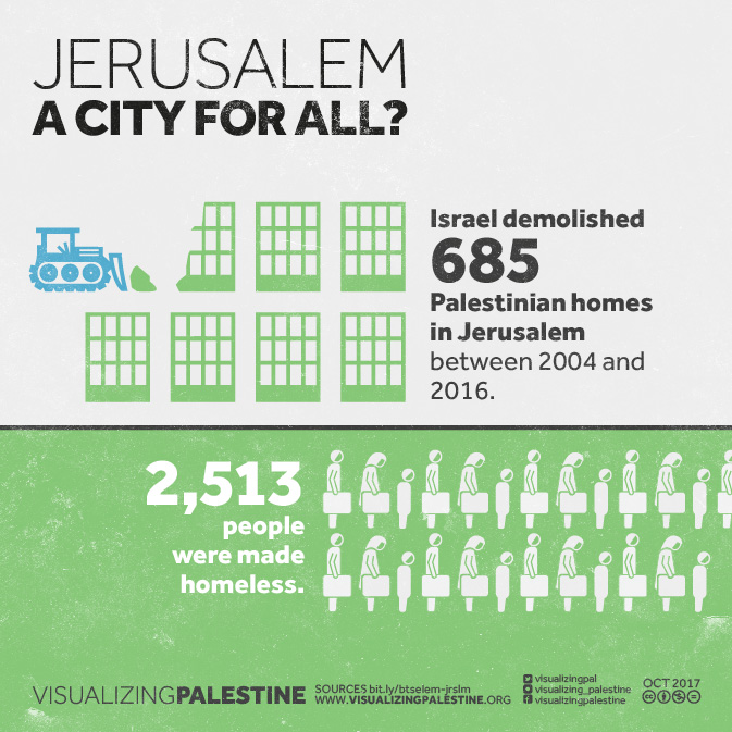 2- 685 Palestinian homes in East Jerusalem were demolished between 2004 and 2016, leaving 2,513 people homeless. Home demolitions are part of a broader Israeli policy to alter the demographic and geospatial makeup of Jerusalem, privileging Jewish settlers over the indigenous Palestinian population.
