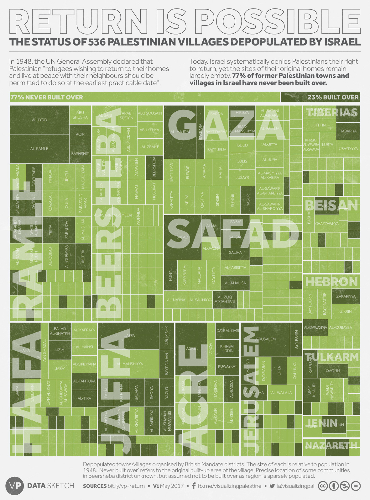 Today, Israel systematically denies Palestinians their right to return, yet the sites of their original homes remain largely empty. 77% of former Palestinian towns and villages in Israel have never been built over.